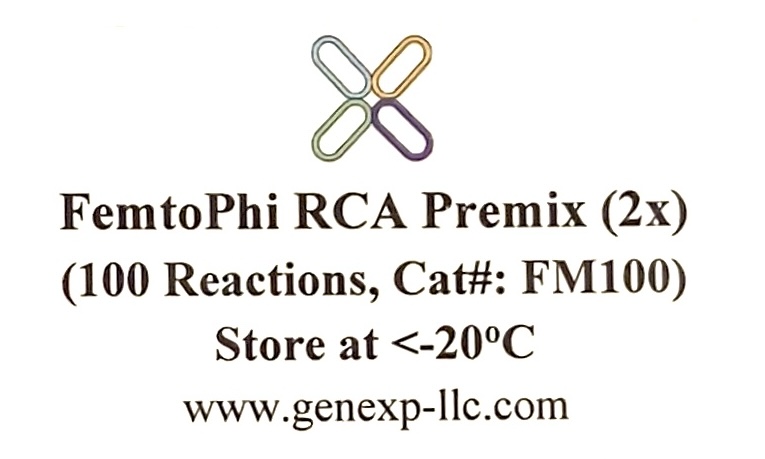 FemtoPhi RCA Premix Kit (Cat#: FM100) is a 2x version premix of FemtoPhi RCA kit, containing all components necessary for a successful and reliable Rolling Circle Amplification (RCA), such as FemtoPhi DNA Polymerase, dNTPs, and random primers etc, except circular DNA template. FemtoPhi RCA Premix Ki has capacity to detect 10 femtogram of plasmid or genomic DNA molecules in 10 microliter of reaction, which is almost 1000 fold sensitive over wild type Phi29 enzyme. Therefore, FemtoPhi would be an ideal enzyme to specifically amplify single cell genomic DNA and low concentration DNA from clinical or environmental samples.
