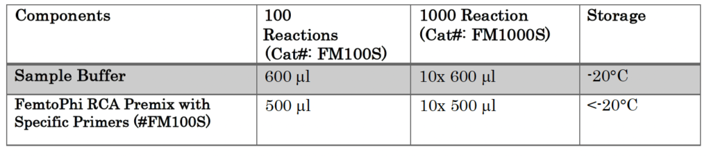 This kit was developed to amplify specific DNA using customized primer(s). It is a premix version of FemtoPhi RCA kit with Specific Primers (Cat#: FP100S).