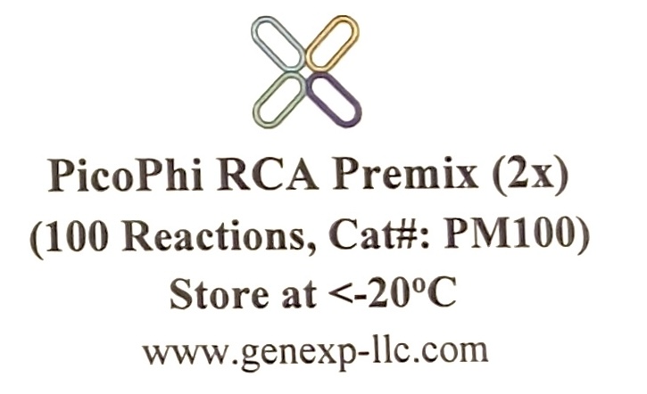 PicoPhi RCA Premix Kit (Cat#: PM100) is a 2x premix version of PicoPhi RCA kit (Phi100), containing all components necessary for a successful and reliable Rolling Circle Amplification (RCA), such as PicoPhi DNA Polymerase, dNTPs, and random primers etc, except circular DNA template. This premixed formulation saves time and reduces contamination due to a reduced number of pipetting steps required for RCA set up. The premix is optimized for efficient and reproducible RCA, an equivalent of PicoPhi DNA Amplification Kit (Cat#: Phi100).